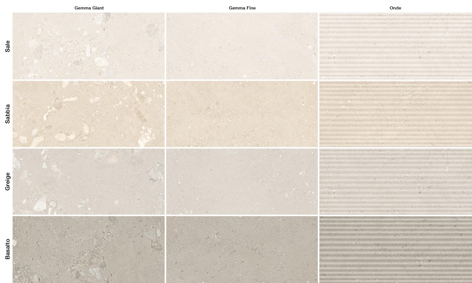The GemmaStone collection offers a range of neutral and natural tones inspired by mineral shades: from warm beige tolight grey and anthracite, to cream. The Onde decor, available for the Gemma Fine variant, introduces a dynamic component to the collection: a wavy motif in which the curvature gradually moves from large to small. Designed for continuous installation, the decor permits uninterrupted laying: the grout line fades into the composition, creating a fluid, textured visual effect that perfectly blends with the environment. The Lappato Antique finish, dedicated to the Gemma Giant line in the 120x120 and 60x120 sizes, in the Sale and Sabbia shades, highlights the contrast between the background and inclusions. The polished pebbles are smoother and brighter, visually emerging from the surface, while the background retains a slight relief, creating a sophisticated and natural perception of depth.