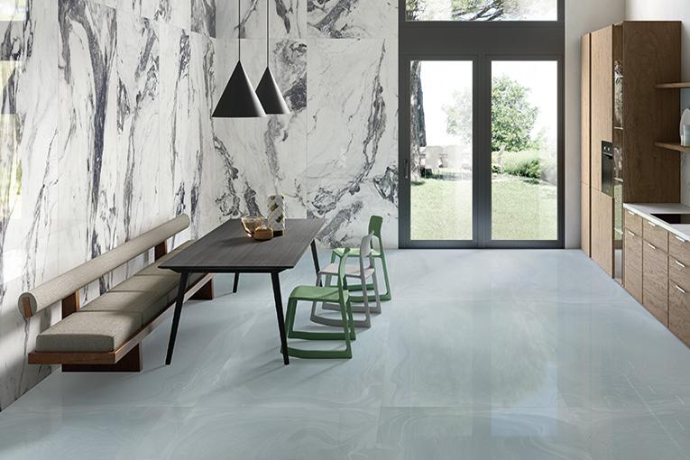 But what is marble-effect porcelain stoneware? Marble-effect porcelain stoneware consists of slabs on which the typical veining, motifs and patterns of marble have been faithfully reproduced to give the impression that it is an authentic natural stone.