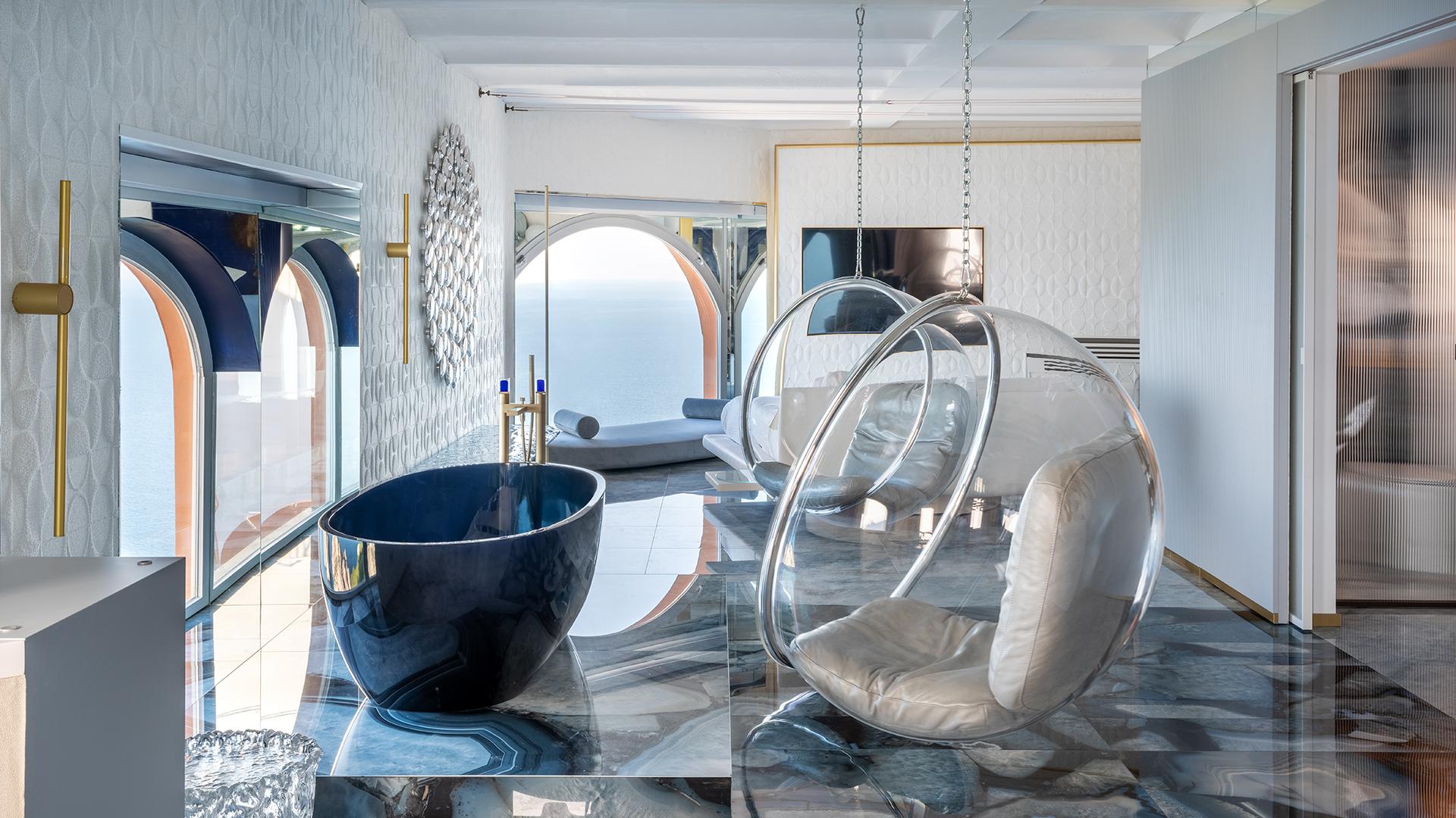 She selected the Tele di Marmo Precious collection for the suite thanks to its original combination of crystals and agates, ideal for re-creating the beauty of the marine ambience.