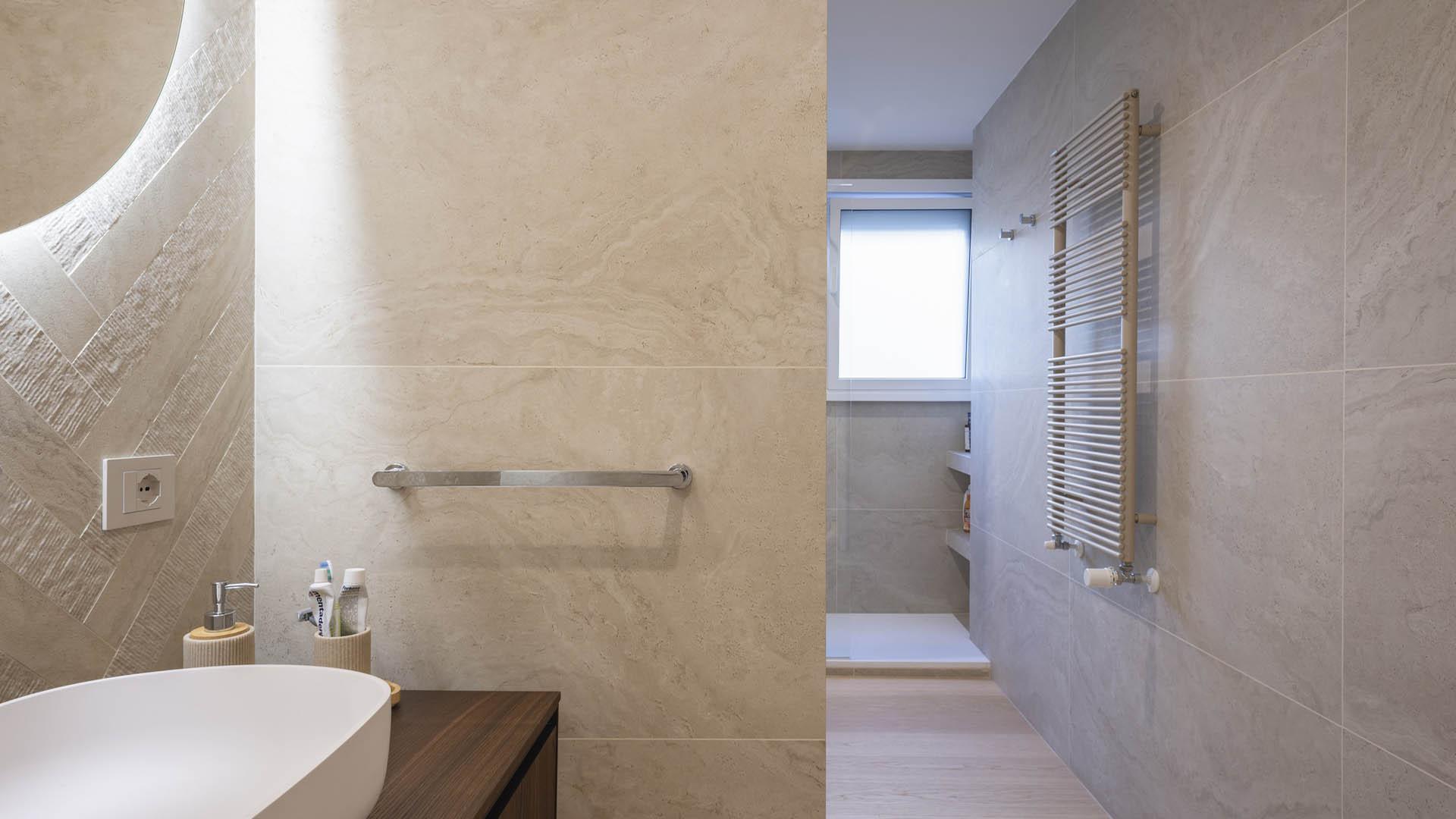The renovation of this home, located in the prestigious Palazzo Domus, has been enhanced by the Unique Travertine collection from Provenza, a tribute to the timeless charm of travertine. In particular, the guest bathroom features the Minimal finish in the Cream shade, creating a warm and elegant atmosphere, while the 7.5x60 cm tiles, arranged in a herringbone pattern and alternated between the Minimal and Ruled finishes, add a dynamic and sophisticated touch to the space.