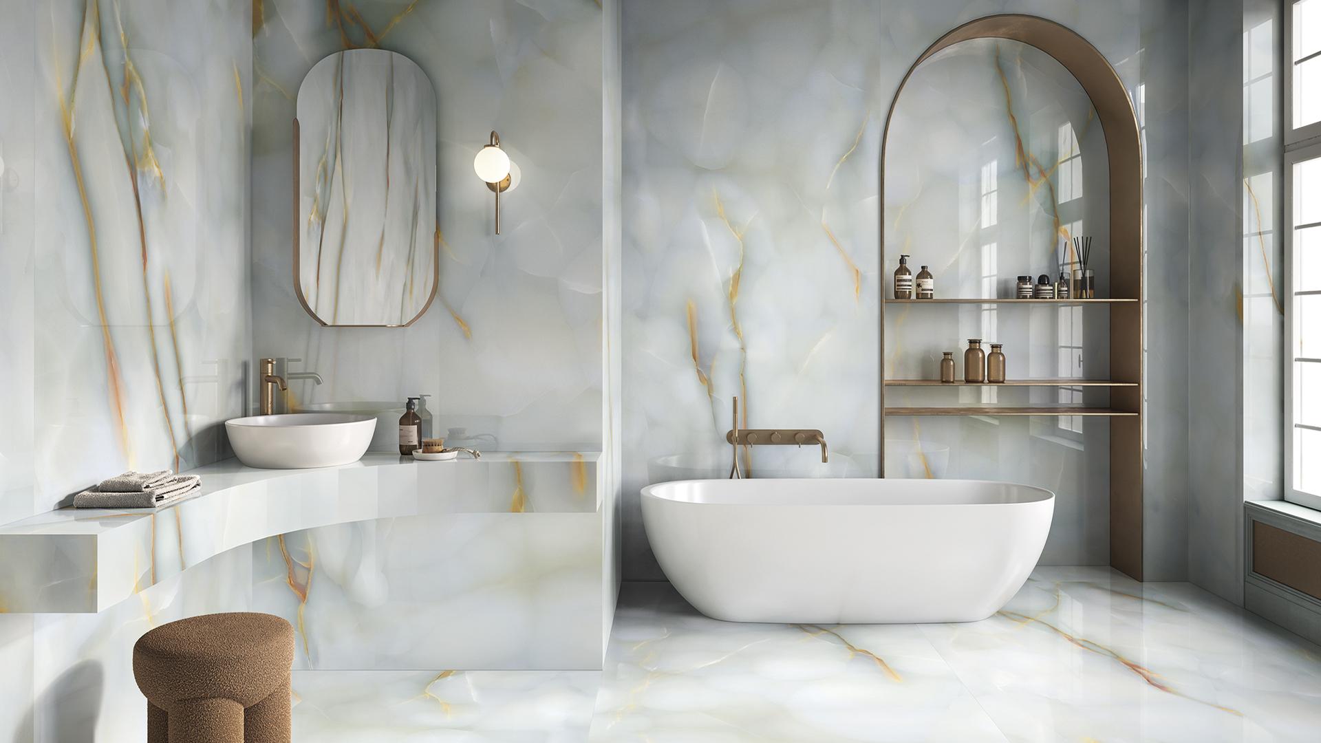 But how can you improve your outdated bathroom? Another important aspect is the choice of materials, which plays a fundamental role in the bathroom's appearance. One of the most refined collections is the Tele di Marmo Pure Onyx by Emilceramica. This collection evokes the timeless elegance of onyx marble, with unique veins and natural sheen. Perfect for walls, floors, and showers, these tiles create a cohesive and sophisticated environment. For example, they can be used to create a focal point within the bathroom, such as a wall behind the bathtub or shower. The distinctive features of this collection include durability and the ability to impart a sophisticated and contemporary look to the space, helping improve one's plain bathroom.