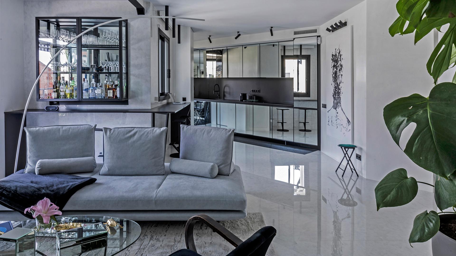 It’s my second project in this city: a super attic of 110 m2 in area with a terrace of 35 m2 offering a stunning view over the vibrant heart of the city. It was a real challenge: the flat has an unusual fan-shaped ground plan and it wasn’t always easy to create rooms with modern design which would also be convenient in everyday life.