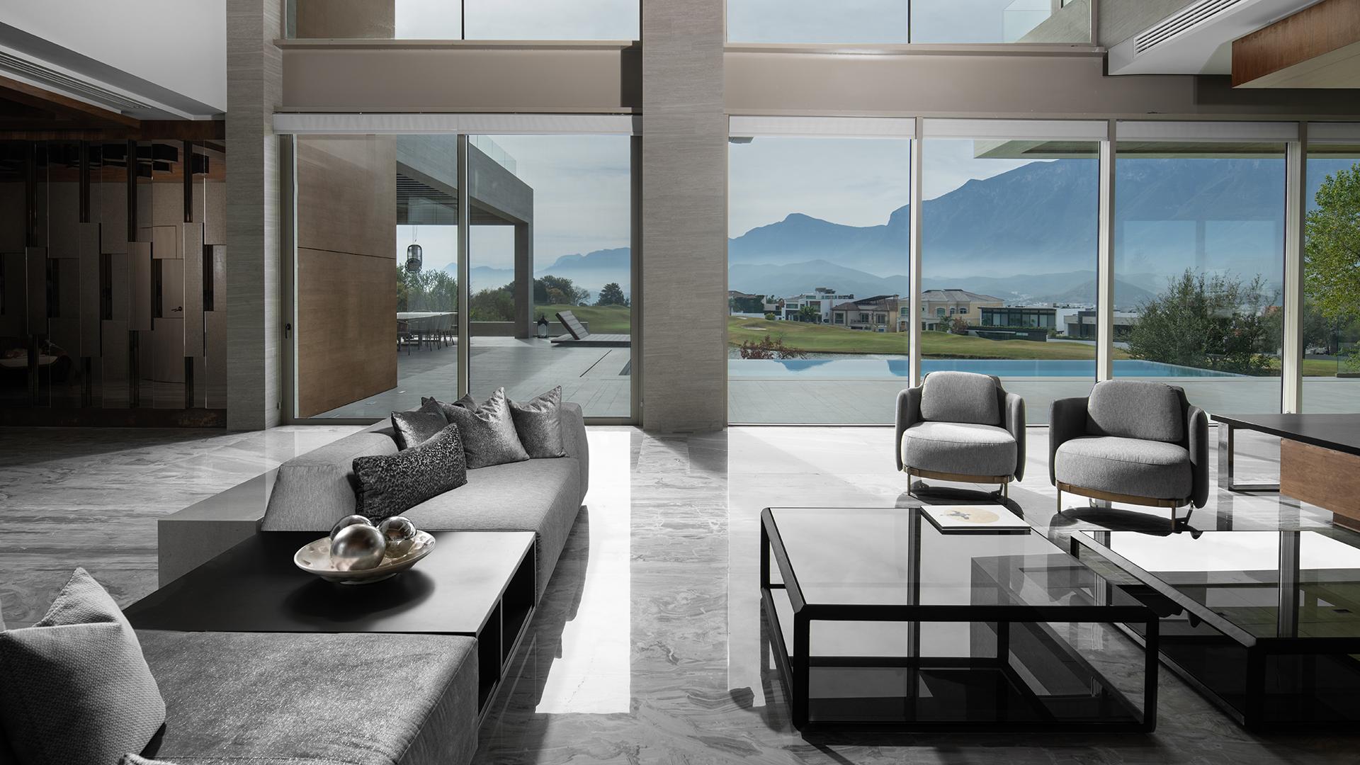 This house is located right in front of a golf course, so we developed a linear scheme so most of the areas of the house took advantage of the views not just no the green but to the surrounded mountains. We designed this house in 3 leves with very clean lines ,to reach a great sense of transparency between the indoors and the outdoors a 50 feet long steel structure was putted in the façade facing the golf course, this allowed us to get great open views.