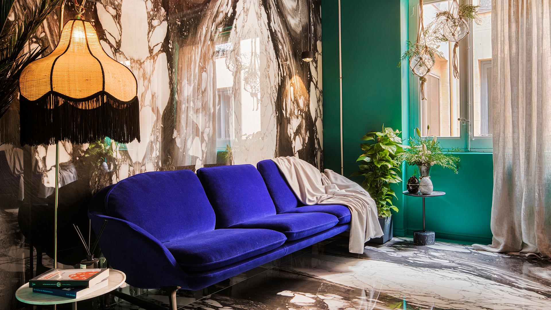 Called “Mainstream”, the space is not based on any of the rules of interior design; instead, the project is inspired by the rules of mainstream culture, born with the entertainment industry and shaped through film. Films were initially in black and white, and so we chose to use a large black and white ceramic surface as the background, created with the Emilceramica Tele di Marmo collection. Then the transition to the entertainment industry brought colour to films, and we represented this by means of the sofa, walls and ceiling in three colours.We’ve created a vibrant, colourful, fun interior, a living-room where you might put a television but which could be equally ideal for a chat with friends, a quiet read, or even enjoying a drink.The other furnishing features we’ve chosen are not strictly connected to the interior design world, but represent its "popular" nature: for example, a plant very widespread in Spain, the pothos, used to be very mainstream and could be seen in every home in the world, before suddenly going out of fashion. We decided to include it in our project. The same applies to the famous Spanish liqueur Licor 43, or the fringes of the lampshade. They’re all features discarded by design, but we’ve salvaged them and featured them here in a new role, as kitsch ornaments in an interior that sets out to be fun, dynamic and above all ideal for leisure time.