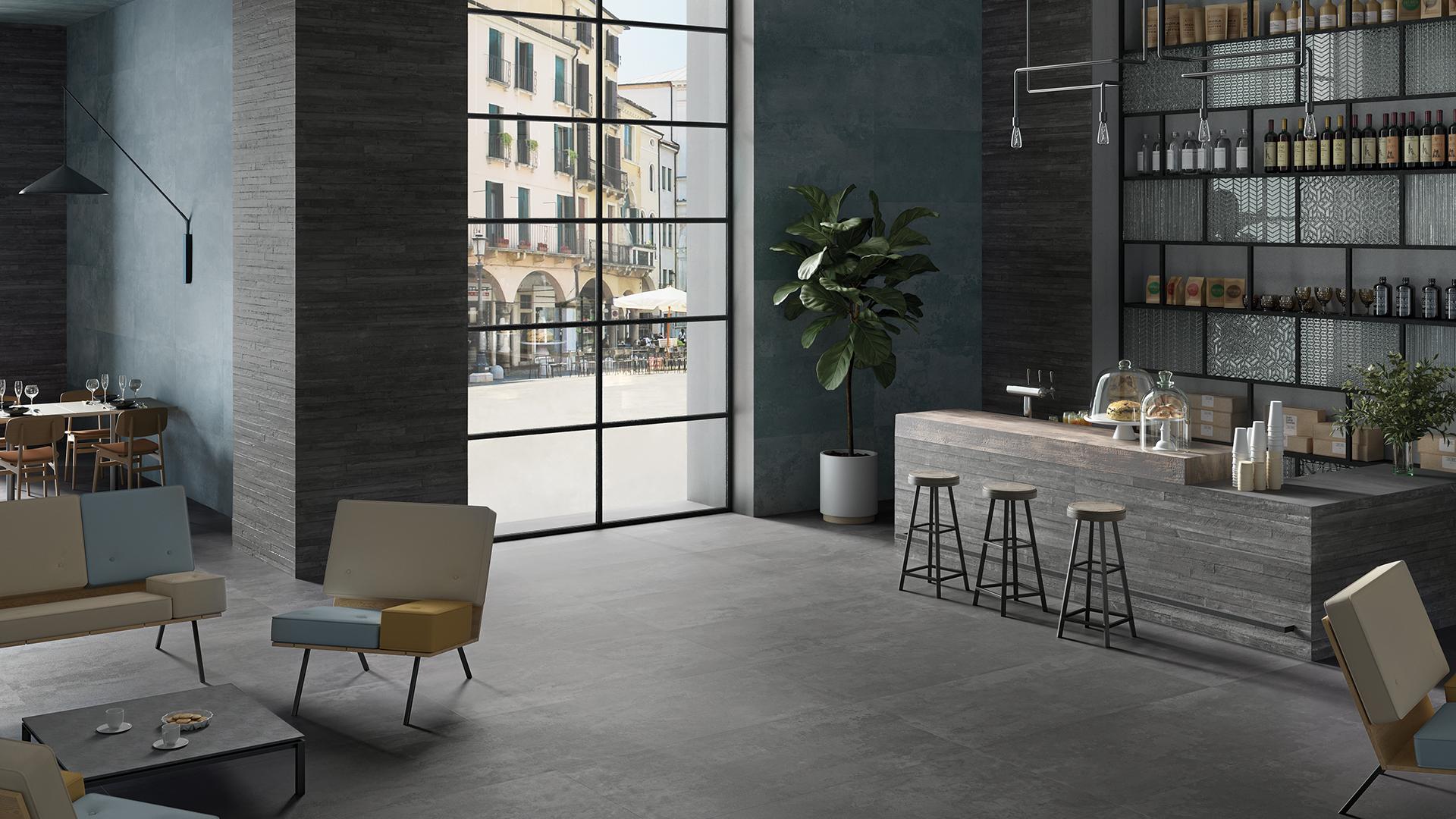 During the last few years, in effect, the concept of wellbeing that everyone applies to their own home has also been widely extended to workplaces, and it also involves interior decoration: the offices and commercial locations where we work must enable us to make good use of our time without restrictions and must withstand inevitably heavy-duty usage. Whether used as office floors or to cover the walls of a shop, porcelain stoneware is an excellent choice because it meets both the needs set out above: using tiles in offices is a way of upgrading these interiors, not just improving their appearance but also making spaces more efficient, with direct benefits for working performances. What’s more, the astonishing variety of stoneware models and variants is able to rescue any space from anonymity: a prefabricated structure with a dull exterior can always amaze on the inside, even with just the right choice of office flooring; on the other hand, it is essential for a showroom displaying fashion products to take care over every detail, even with a minimalist approach. For example, just think of the simple appeal of concrete, often used in industrial contexts but never out of fashion. Re-Play Concrete by Provenza gives this material the right touch of elegance and functionality: the wide range of colours (Sand, White, Grey, Dark Grey and Verdigris) and structured surfaces (Recupero, Cassaforma Flat, with the marks left by wooden planks on the concrete, and Cassaforma 3D, with relief effects) is able to tastefully enhance any interior, without being strident or distracting. An open-plan showroom in the authentic shades of concrete-effect stoneware is much more impressive in large tile sizes: the Recupero and Cassaforma 3D effects, in particular, are available in the 60x120 size, which minimises all breaks and joints.