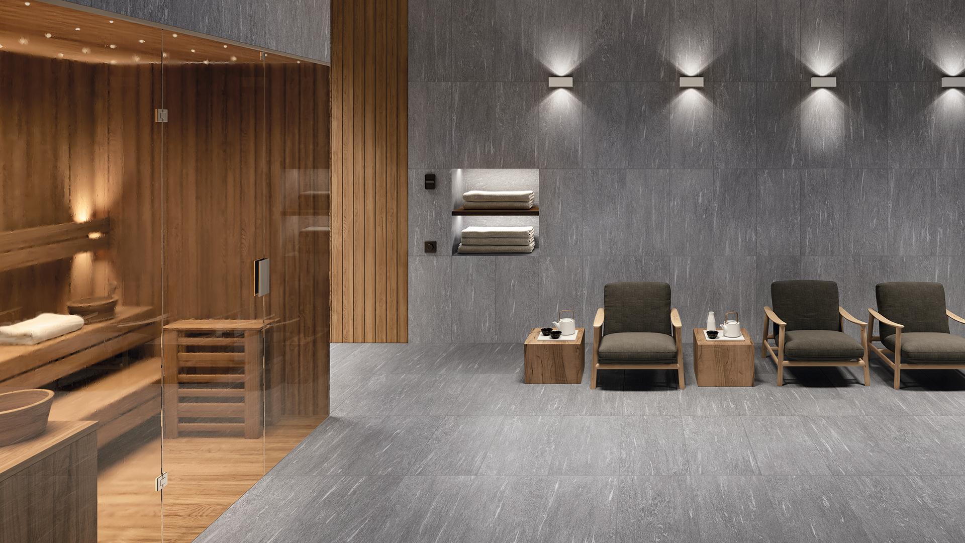 Now let’s talk about the third colour that characterises stone-effect floors: Slate. This very fashionable colour is perfect for countless solutions: it can be used to add a touch of style to living rooms, bars, restaurant or shops. Slate black stone-effect porcelain stoneware tiles are suitable both outdoors and indoors and in public and private spaces. It is a colour that inspires trust and exudes lots of elegance. It is a shade midway between very dark black and grey that goes perfectly with all items of beige, cream or sand-coloured furniture but also very light greens and blues. In addition, one particular feature of slate-coloured stone-effect stoneware is that all its nuances encourage relaxation, concentration and wellbeing.