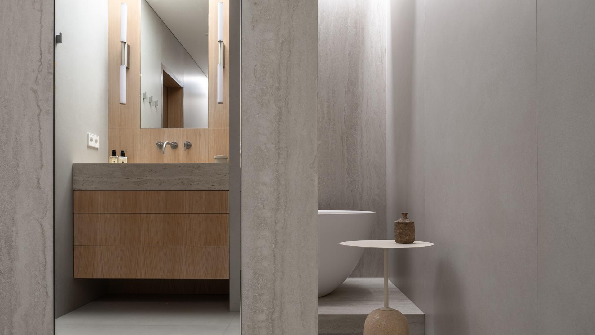 Some warm materials were then added to the bathroom, such as oak, which beautifully contrasts with travertine and concrete tiles.