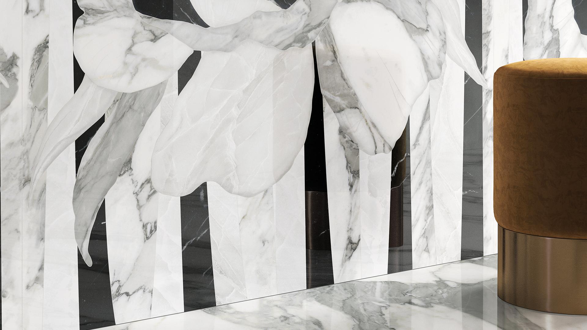 Marble also has a distinctive pattern that has set it apart for centuries: its reproduction on large marble-effect ceramic slabs enables you to improve on the original, choosing from an extensive range of decorations and motifs which increase your customisation possibilities. Different shades, patterns and textures can be adapted to different purposes and the most diverse interior design tastes. Emilgroup has made these decoration details part of various collections of large slabs in order to enhance their aesthetic sophistication without compromising on construction quality and their faithfulness to the natural material.
