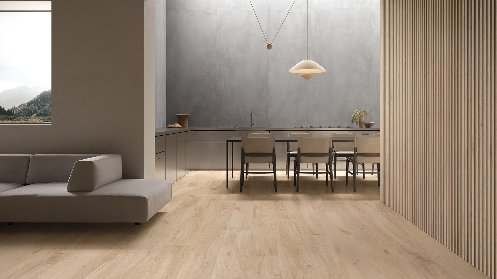 The available colors in the collection—Pale Oak, Golden Oak, Weathered Oak—complement the typical neutral and earthy color palette of wabi-sabi style, creating a warm and welcoming atmosphere, ideal for a convivial space like the kitchen. The innovative dimensions of the planks allow them to adapt to functional and aesthetically coherent compositions with the minimalist and open layout of the kitchen.