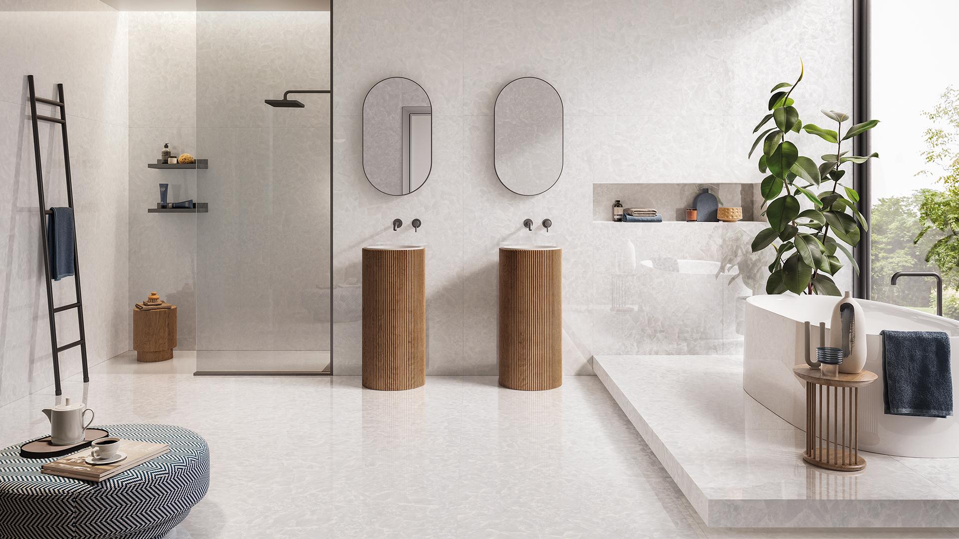 Another aspect to consider about white marble-effect tiles is the overall harmony that they bring to the whole space that they occupy. Porcelain stoneware is renowned for being the perfect solution for creating continuous surfaces made with thin large-size slabs that can create environments with a minimalist aesthetic, but incredible charm. A seamless white marble-effect floor is a great way to make rooms more spacious.