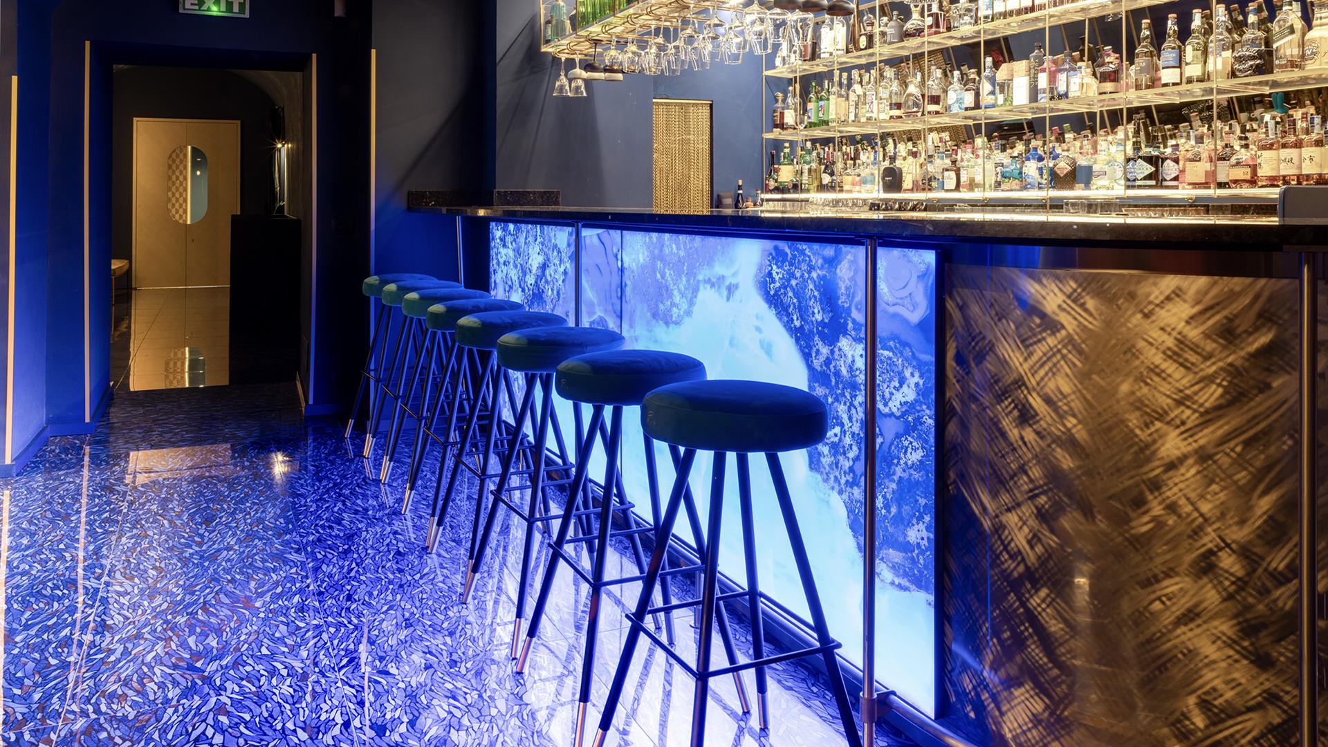 The Narciso collection was used to re-floor the entire bar. The Frammenti decoration was used in the shade Zaffiro in the sizes 60x120, 30x60, 146x590 and 46x1200.