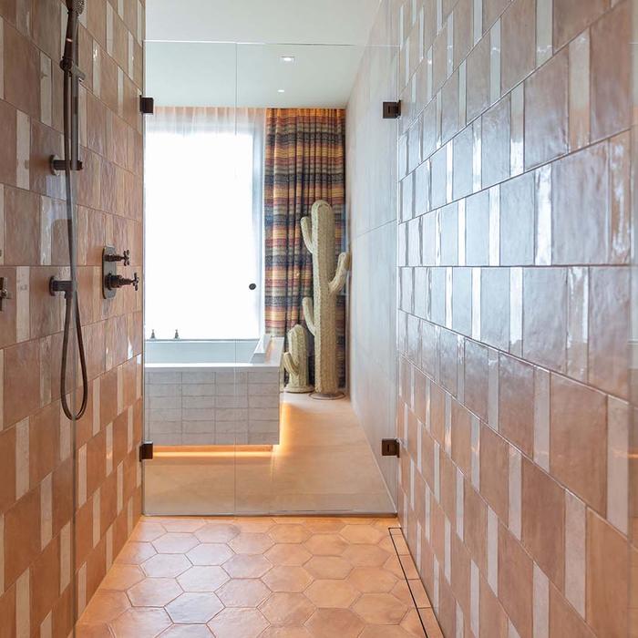 In the bathroom, the alternation of the Rosato and Bianco Assoluto shades defines the various areas with creativity, while the bathtub and washbasin zone is highlighted with glossy, pure Bianco Assoluto Brick surfaces, which dialogue with the matt pinkish tones. This imaginative use of materials and finishes generates an ambience of Mexican vitality, interpreted in a bold, sophisticated mood heightened by the language of contemporary luxury.