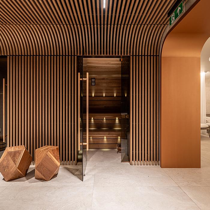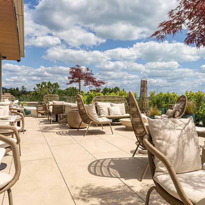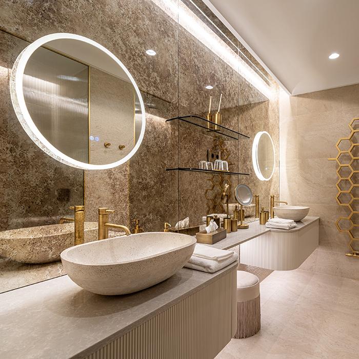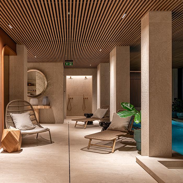 Unique Travertine by Provenza interprets this dialogue between past and present by uniting the power of a classical material like travertine stone with the elegance of contemporary design. The collection was used, in 60x120 size in Minimal Cream and Ruled Cream versions, in the spa areas and on the rooftop, creating exquisite spaces that dialogue with the historic architecture. In the suite bathrooms, the colour scheme is enriched with the Minimal Chocolate variant, introducing warm, sophisticated contrasts that add appeal to these private spaces.