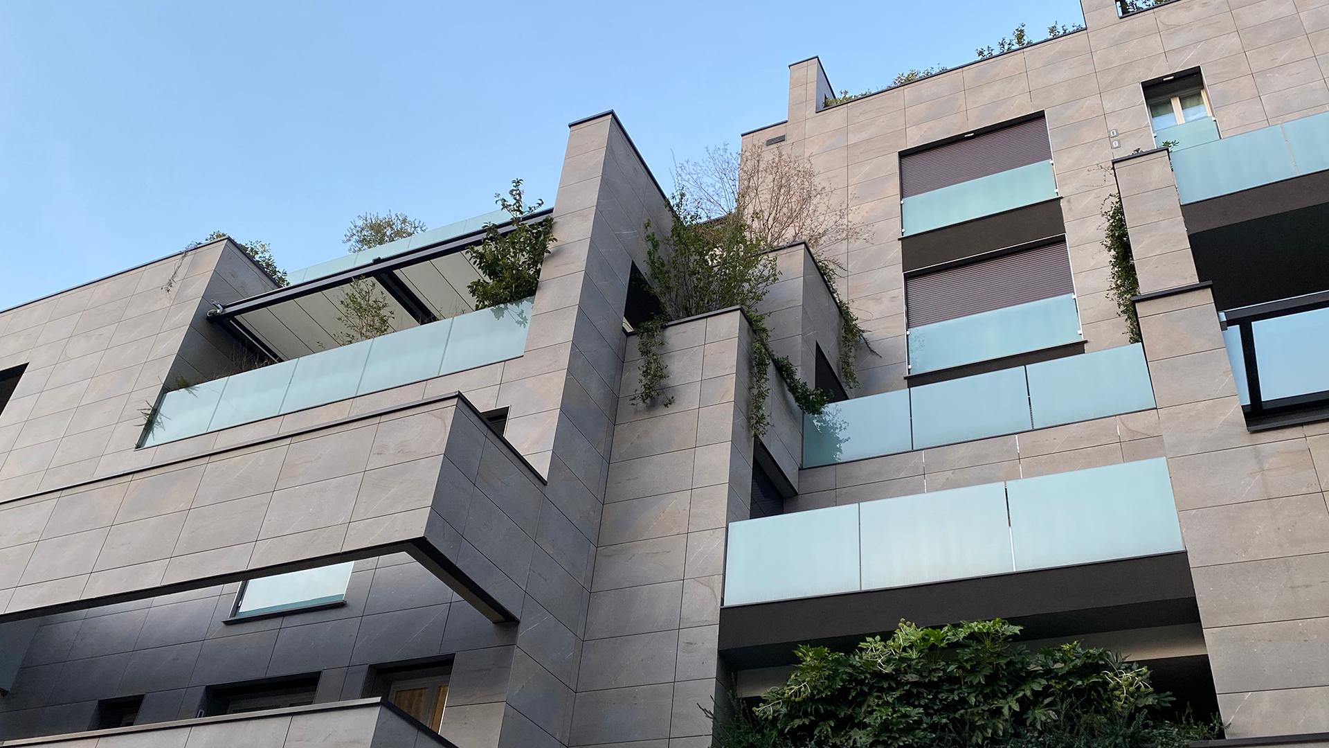 The building consists of a series of sections entirely clad with stone-effect porcelain stoneware tiles and has 8 floors, with a total of 23 residential units.