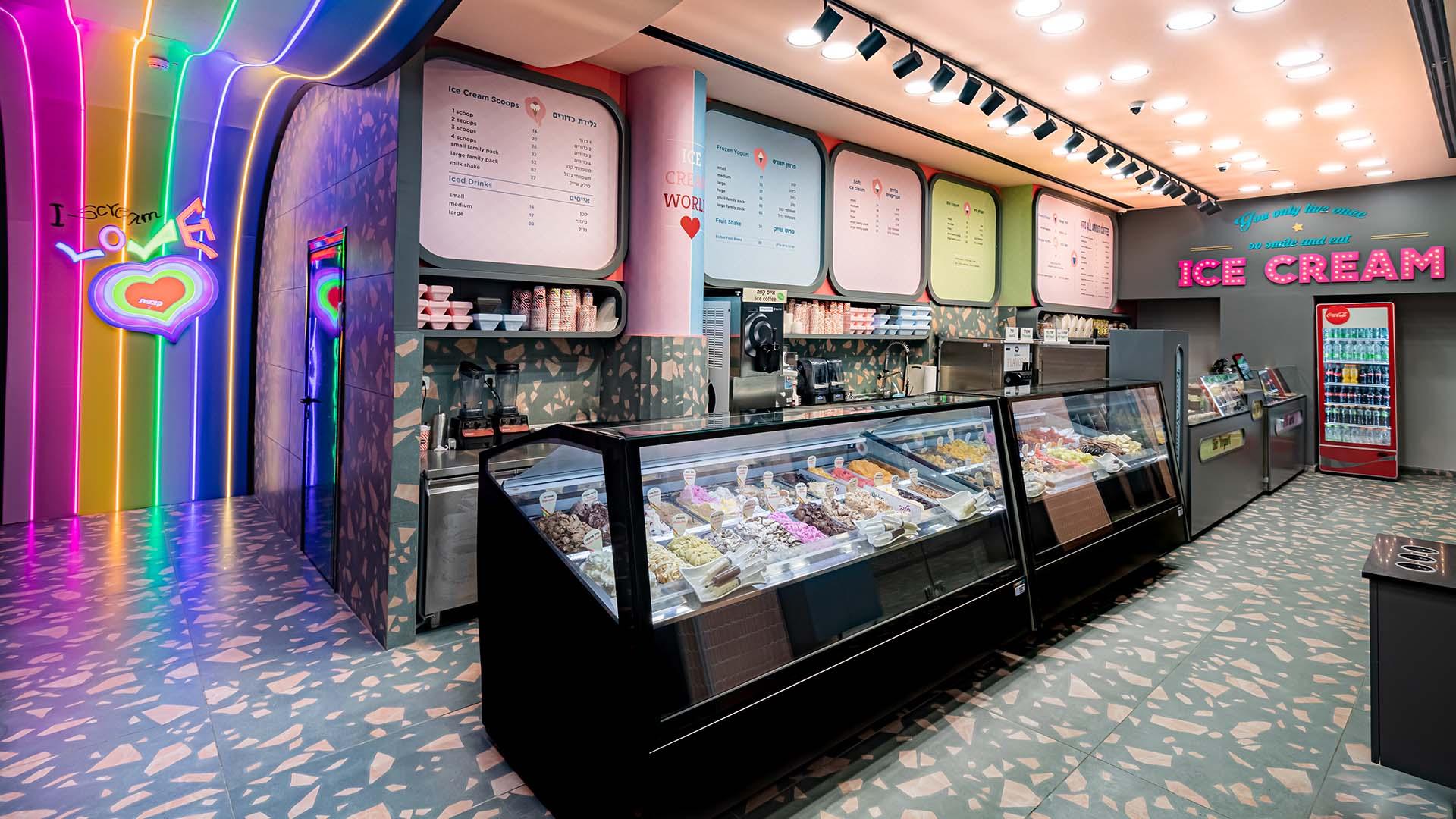 “The basic idea for the ice cream parlour was to create a location that would be tagged on social media,” designers Tali Brodt and Galya Lousky Giladi explain.
