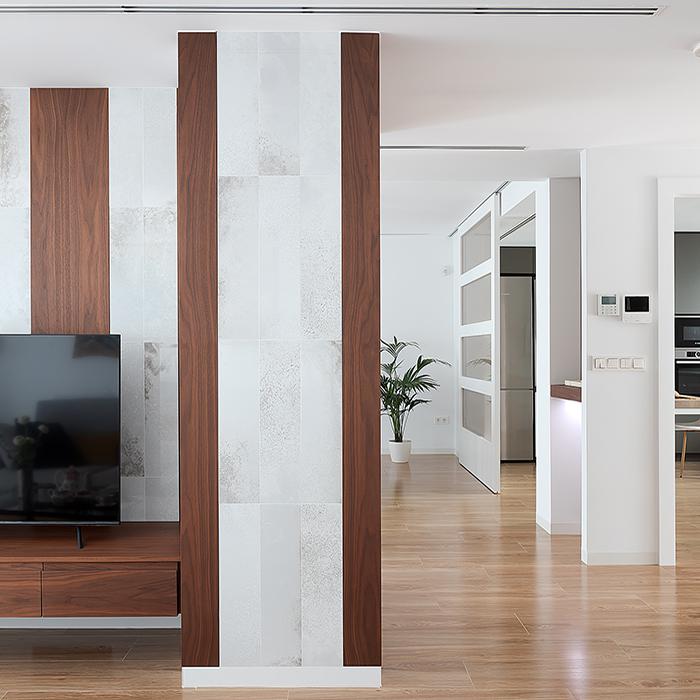 Perfectly integrated in its context, the collection was utilised in an original way by architect Raúl Lorente: the 30x60 cm size was installed vertical, in Perla colour, to cover the partition wall between the lounge and the dining room. The elegant wooden inserts create an attractive mix and enhance the Narciso collection’s distressed antique mirror effect.